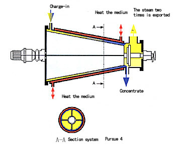 圓錐型薄膜蒸發(fā)器,依賴于轉(zhuǎn)子施于物料一個(gè)離心力,這離心力有兩個(gè)有效力,一個(gè)垂直于加熱面,另一個(gè)朝大直徑端體的方向(注意:相同的結(jié)果同樣出現(xiàn)在垂直圓錐型薄膜蒸發(fā)器里)依靠這些力產(chǎn)生物料加速,而且進(jìn)入的物料保證加熱面充分潮濕,不依賴于蒸發(fā)比或進(jìn)料速度。因此,局部物料過熱和熱降解被減少或完全消除。